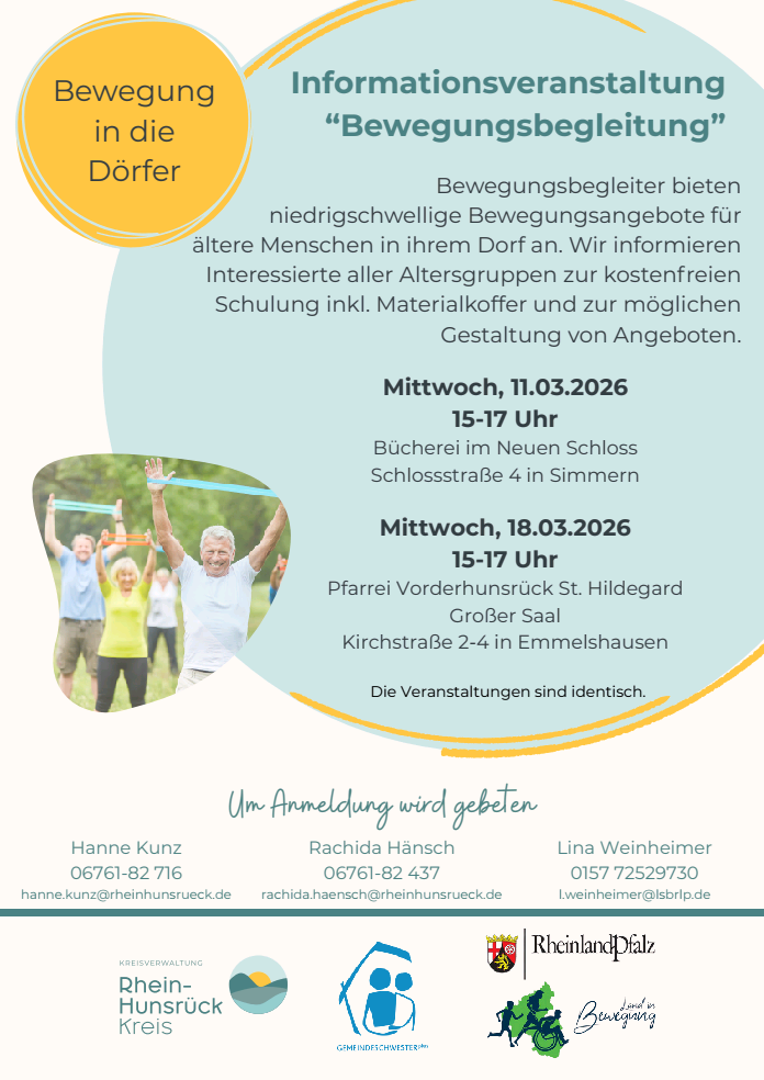 Bewegungsbegleiter bieten niedrigschwellige Bewegungsangebote für ältere Menschen direkt im Dorf an. Informiert wird über die kostenfreie Schulung inklusive Materialkoffer sowie über Möglichkeiten zur Gestaltung von Angeboten.